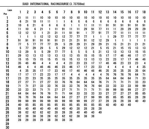 文部科学大臣杯 2010年 MFJ 全日本ロードレース選手権シリーズ第4戦 SUPERBIKE RACE in SUGO 主催:スポーツランドSUGO(3,737.5m) ラップチャート DATE:2010-8-29 決勝周回数:18周 天候:曇り コース状況:ドライ